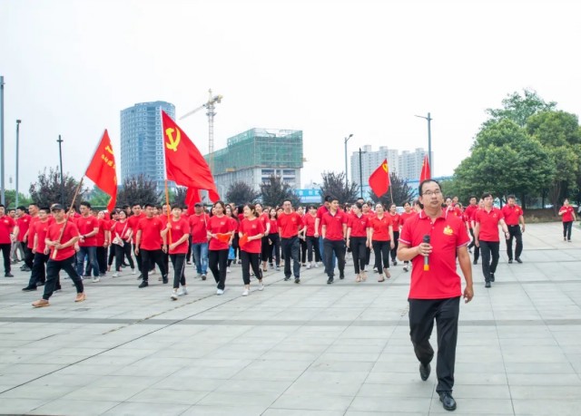 在他們身后,200名身著紅色T恤的黨員在董小輝、楊哲等帶領(lǐng)下,一邊揮動(dòng)手中國(guó)旗,一邊隨著樂(lè)曲向平臺(tái)緩緩匯聚,在平臺(tái)中心擺出了一枚鮮艷奪目的“黨徽”。