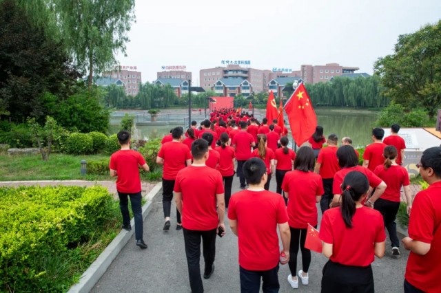 蔚藍(lán)的天空下,闊大的中心湖平臺(tái)上,一面鮮艷的黨旗高高聳立。兩名旗手高舉黨旗和國(guó)旗,沿著炎黃科技園黨建長(zhǎng)廊向平臺(tái)飛奔而來(lái)。